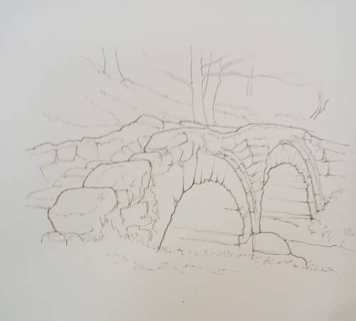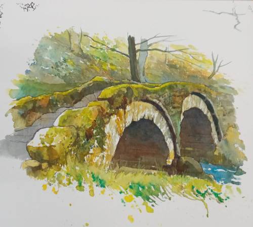 More flicks of dark paint were put on the trees. Then, turning the paper upside down, and switching to a larger brush, he further darkened the areas under the bridge. Using turquioise he painted in the water under the bridge. The palette was cleaned so he could mix a “zingy” green using yellow and cobalt blue, tinkering a little here and there to bring the scene to life. Finally, using a rigger and using gouache white with a tiny bit of yellow he added small areas of around the base of the bridge to indicate water movement.