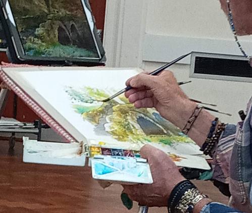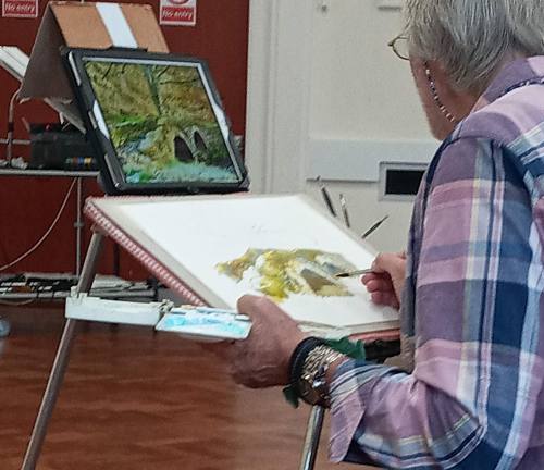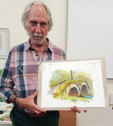 Having to previously cancel Barry’s scheduled visit in October, we were finally able to welcome artist Barry Herniman to present a demonstration in watercolours, the first of our 2024/2025 year. This demo wasn’t without a further hitch due to a cable breakage on the projector equipment, which meant the audience were unable to watch proceedings on the large screen. Barry paints sitting down with his easel slightly tilted, meaning it was difficult for many in the audience to follow his brushstrokes and actions. To overcome this, at intervals during the session, he walked around the audience to show where he was in the process. Following our refreshment break, committee members rearranged the seating so we were gathered closer around Barry to watch how he expertly completed his watercolour scene of a woodland bridge. Even so, it was difficult to follow his precise order of painting despite his excellent commentary, but I trust I have caught the main points.