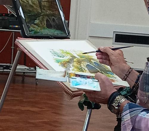 Beginning with a loose undercoat of basic colours (yellows) with a pointed round brush he dabbed in the background trees, and using yellow and a mixed green, flicked on the paint to create the moss on the bridge. With the end of the brush he also created foliage, painting up to the edge of the bridge, following his reference photo, keeping the light areas of bridge white, and working from light to dark. Reminding us this was all still the underpainting and that one doesn’t have to fill in the whole surface to create a picture, often a vignette can be a far more pleasing image, which was what he was painting today, he painted in the dark areas around the bridge, occasionally using the brush ferrule to create virtual lines with manganese violet and orange plus cobalt blue, concentrating on the main focus of the painting – the bridge.