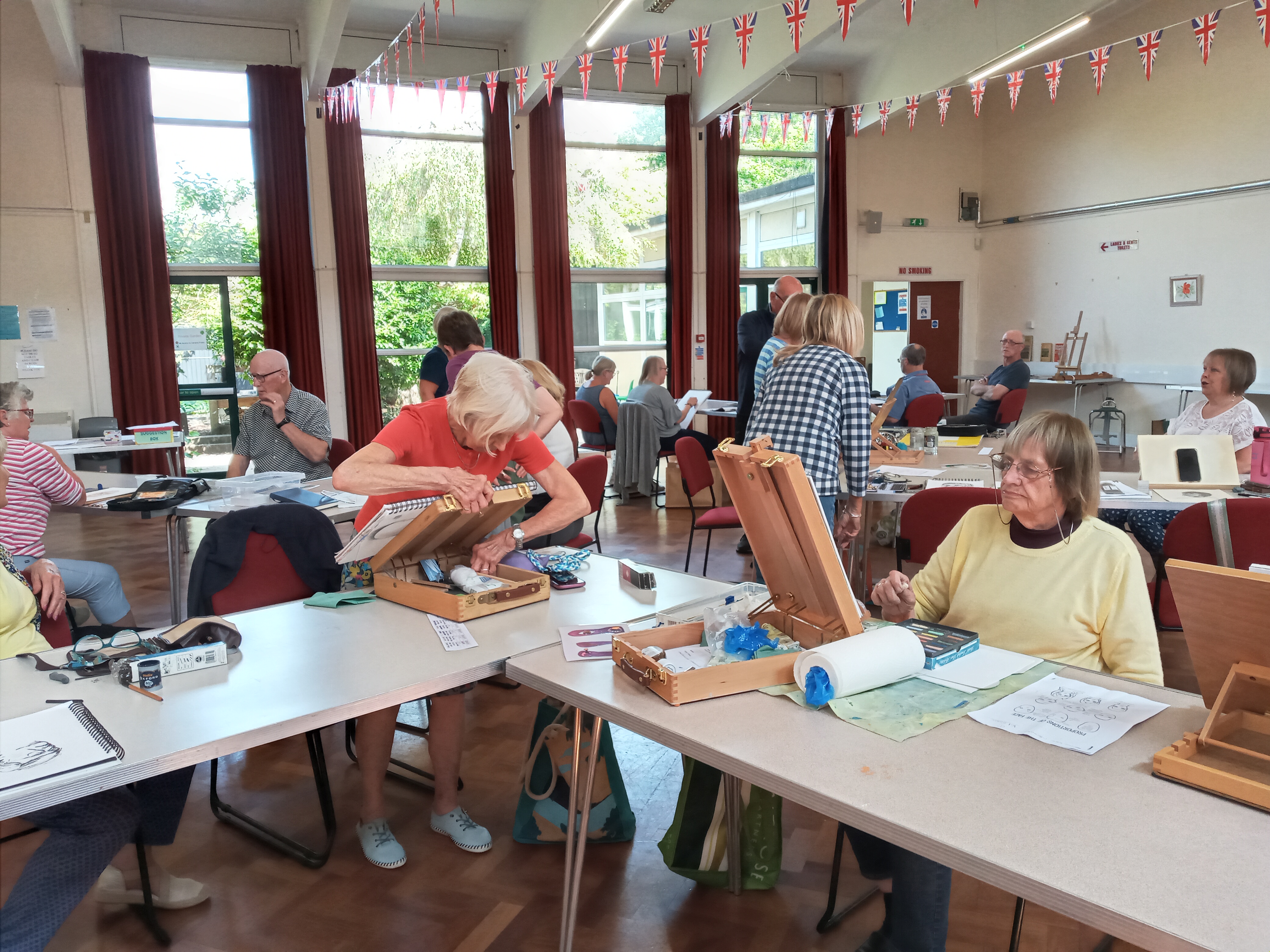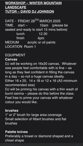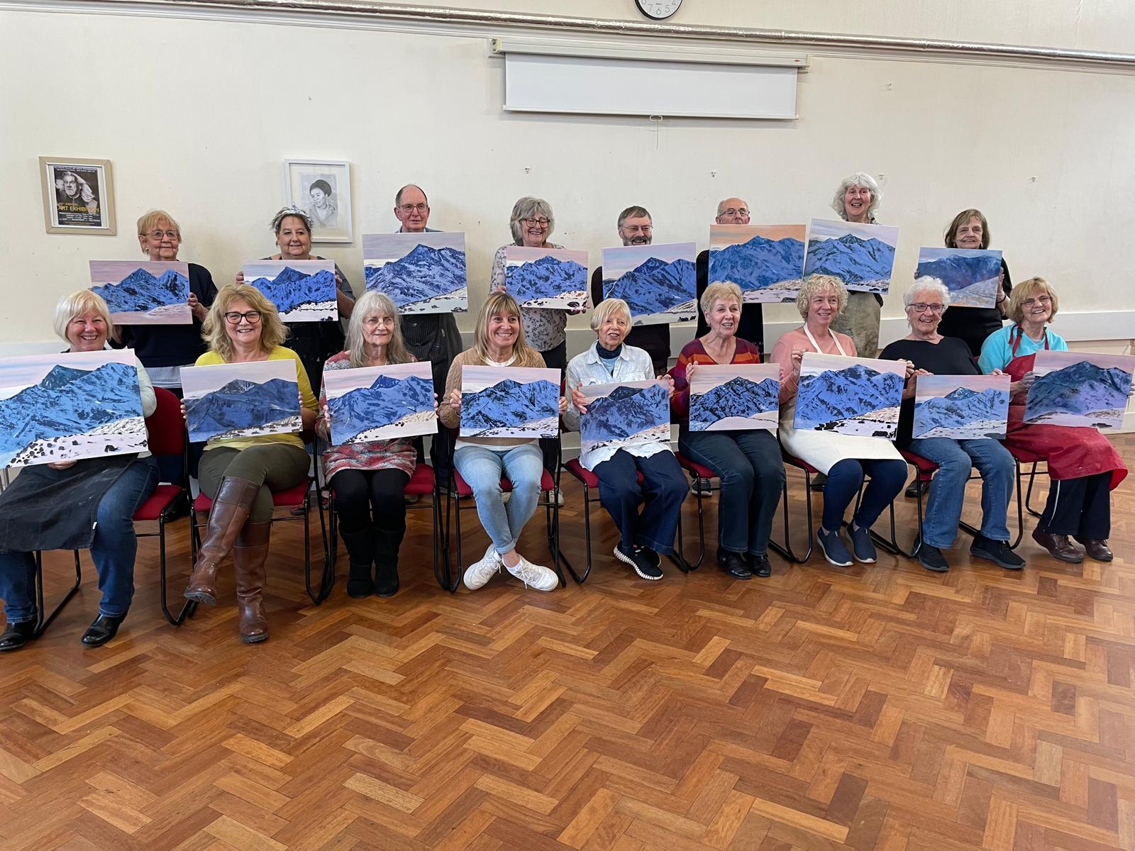 March 2025 saw an all day workshop with professional artist David DJ Johnson painting a brilliant “Winter Mountain”, following on from his demo to the group a few weeks beforehand. The day was well attended and enjoyed by all, including David himself who provided an equipment list beforehand. Excellent work was achieved by everyone.