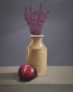 Shadows to the plum and vase on the background using Paynes grey, blue and raw umber were added, but Mike was not happy with the result so wiped it off.