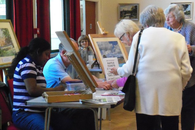 Money raised via the entrance fee to the exhibition; the raffle, the prizes being three framed paintings donated by professional artists who have this past year given painting demonstrations to our members; from sales at the refreshments table weighed down by a glorious selection of home-baked cakes and savouries made by members; a percentage from painting sales; and other donations will be presented to the charity in due course.