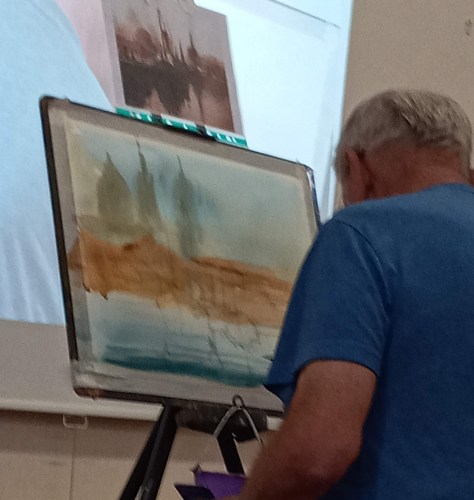 On 140gm Bockingford paper and using a “Chinese brush”, he covered the paper in his loose and quick style with undercolour (CB and BU) just to get colour on the paper, emphasising it is difficult to judge when it’s dry enough to move on, the secret being practice, practice, practice, it doesn’t matter if the painting is not right, just keep practicing and eventually you will be “in the zone”.