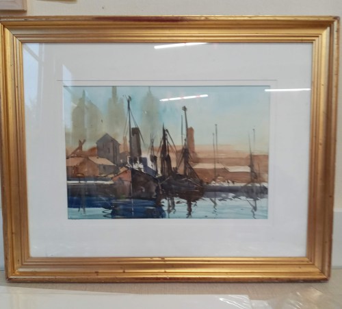 If two paintings were not enough, after a short break, Steve began a 3rd piece, this time of boats in Liverpool docks. Keeping the picture as simple as he could as the picture he was using was a complicated, busy scene, he draw the shapes of things he wanted to include. In his loose, swift style, the sky was put in (CB) a pale yellow/green brown for the land and distant buildings, and CB again for the water.